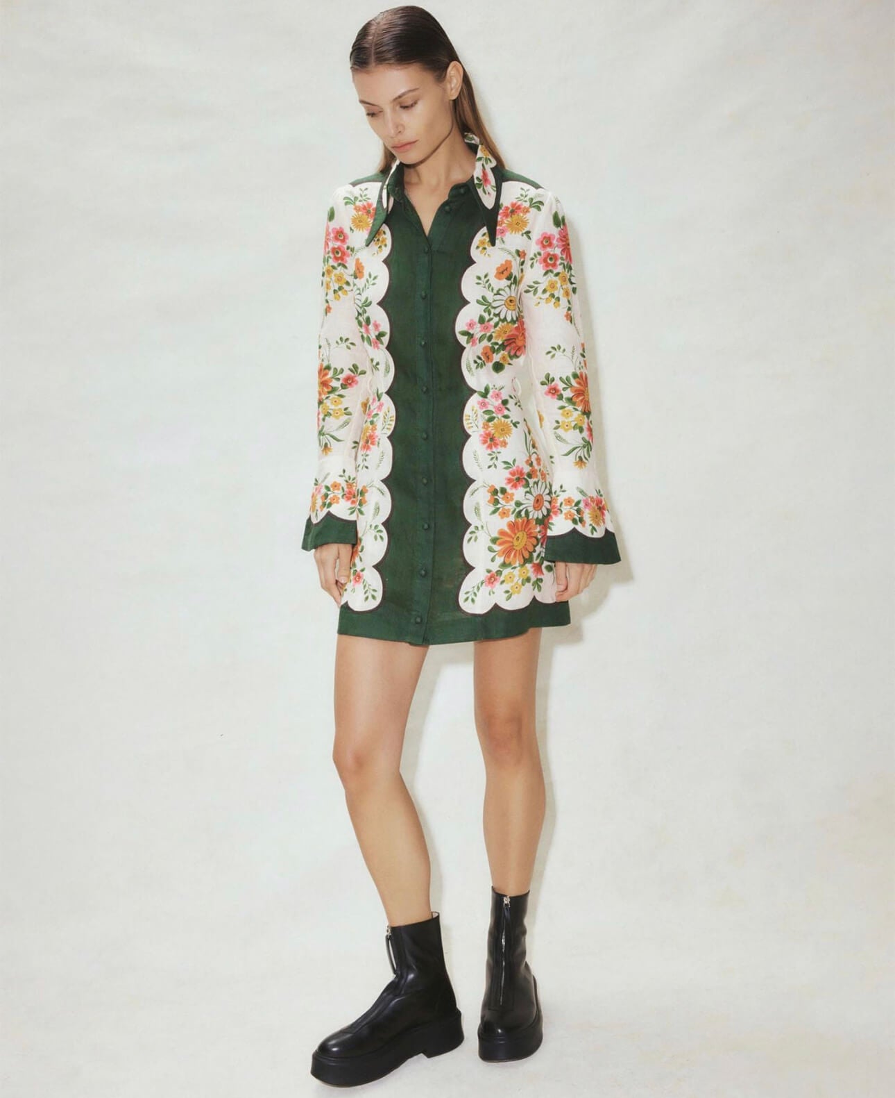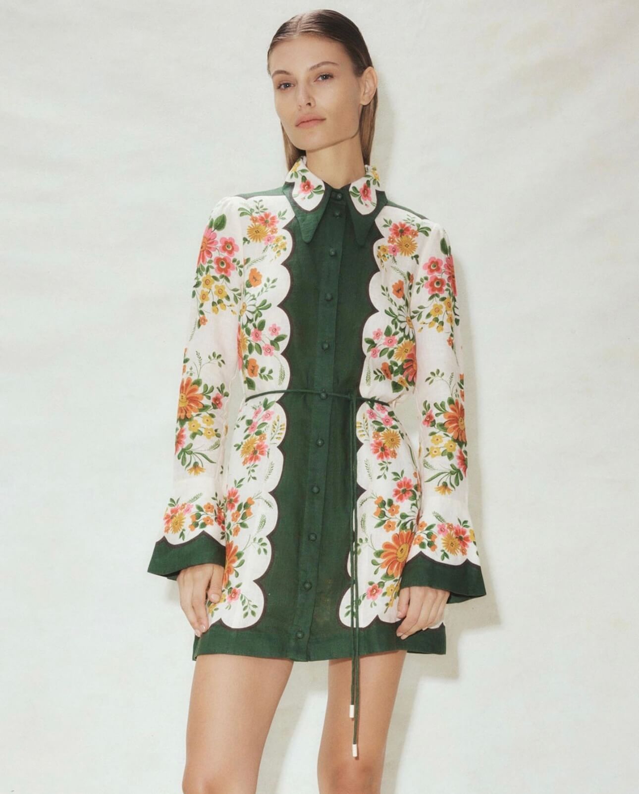 Feminine floral shirt dress by Alemais. A versatile shirt-style design features a collared neckline, long sleeves, and button-through front with a self-tie on the waist and mini length.
