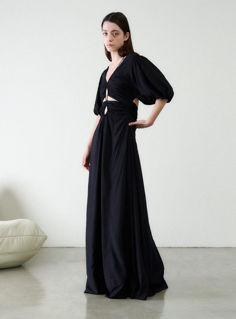 Elevate your style with the Palladi Maxi Dress, a voluminous show-stopper designed to make an impression. Featuring a flattering deep V-neck and striking cut-out details across the front, this dress combines bold design with timeless elegance. The dramatic balloon sleeves and elegant open back add a touch of flair, making it perfect for any occasion—dressed up or down.