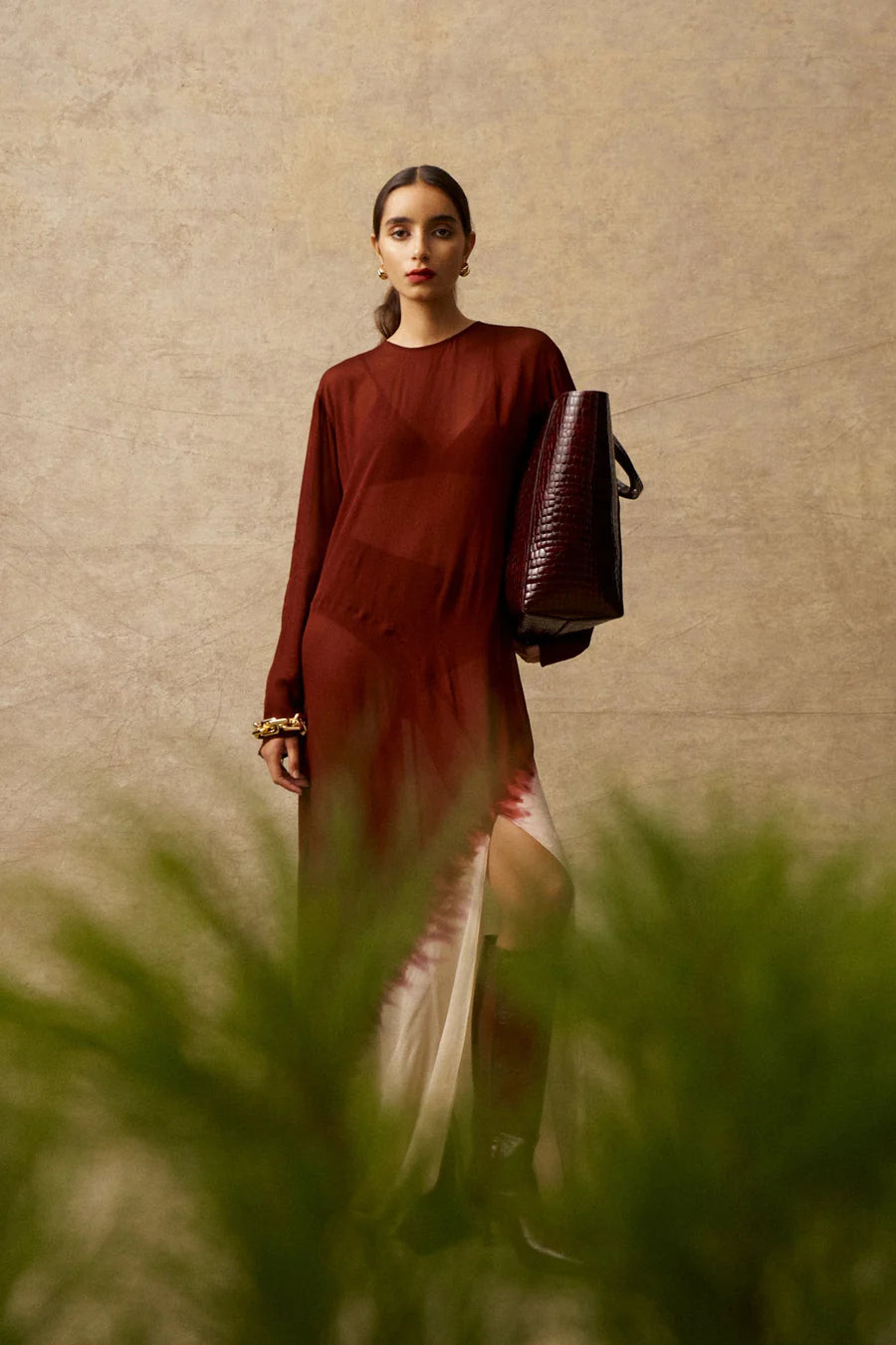 Ethereal and effortlessly elegant, this long-sleeve maxi dress is crafted from airy georgette with a tonal dip-dye effect that creates a soft yet striking contrast. The fluid silhouette and sheer finish offer graceful movement and endless styling potential—layer it over a tonal slip for subtle sophistication or embrace a bolder edge with nude underpinnings. Rendered in a dreamy Merlot Cloud, this piece blurs the line between statement and staple.