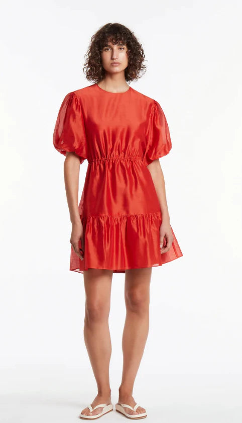 Sir the Label Lucelia Puff Sleeve Mini Dress in Red. Cut in a mini length, this mini is cut from a luscious signature silk cotton blend fabrication in a joyful red. Fully lined, it is designed to sit on the neckline and fitted through the elasticated waist detailed with drawcords and feminine puff sleeves.