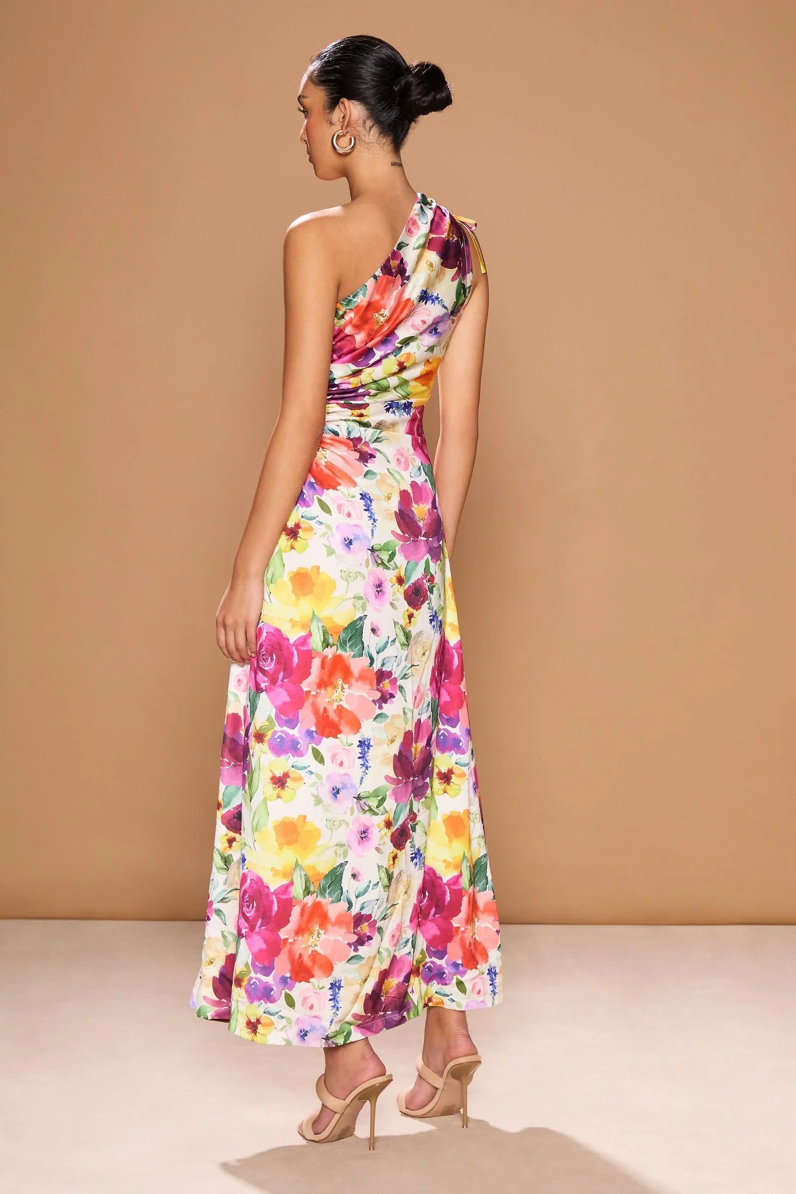 - Sensual one-shoulder silhouette with adjustable tie at the waist/hip