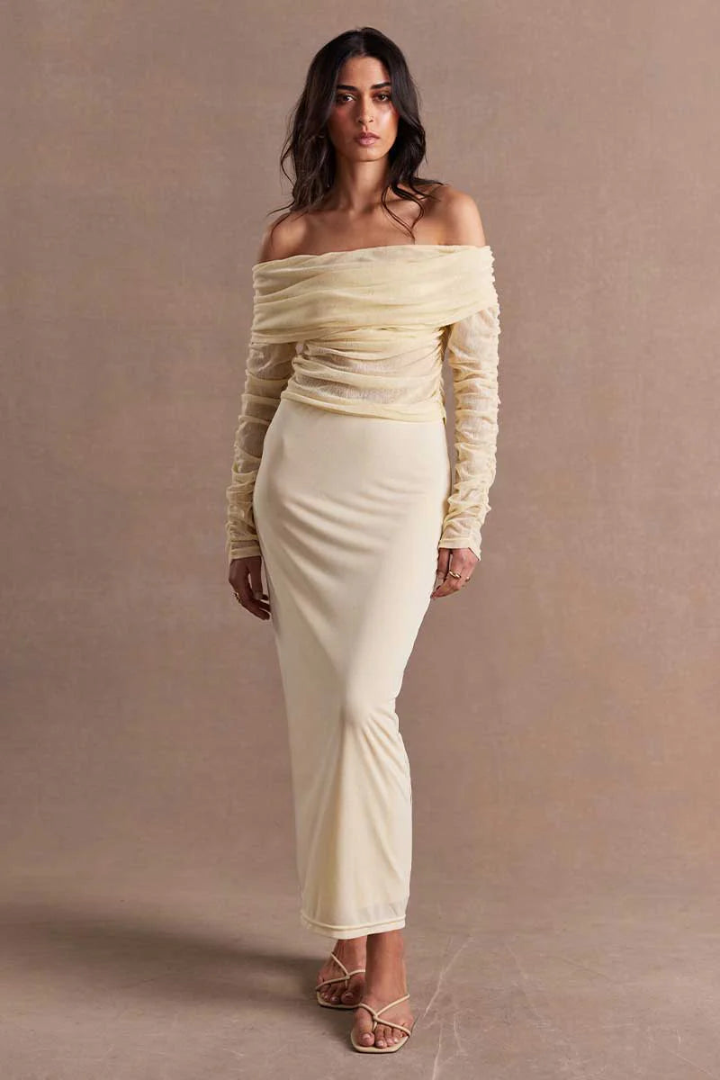 - Sheer mesh off-the-shoulder design