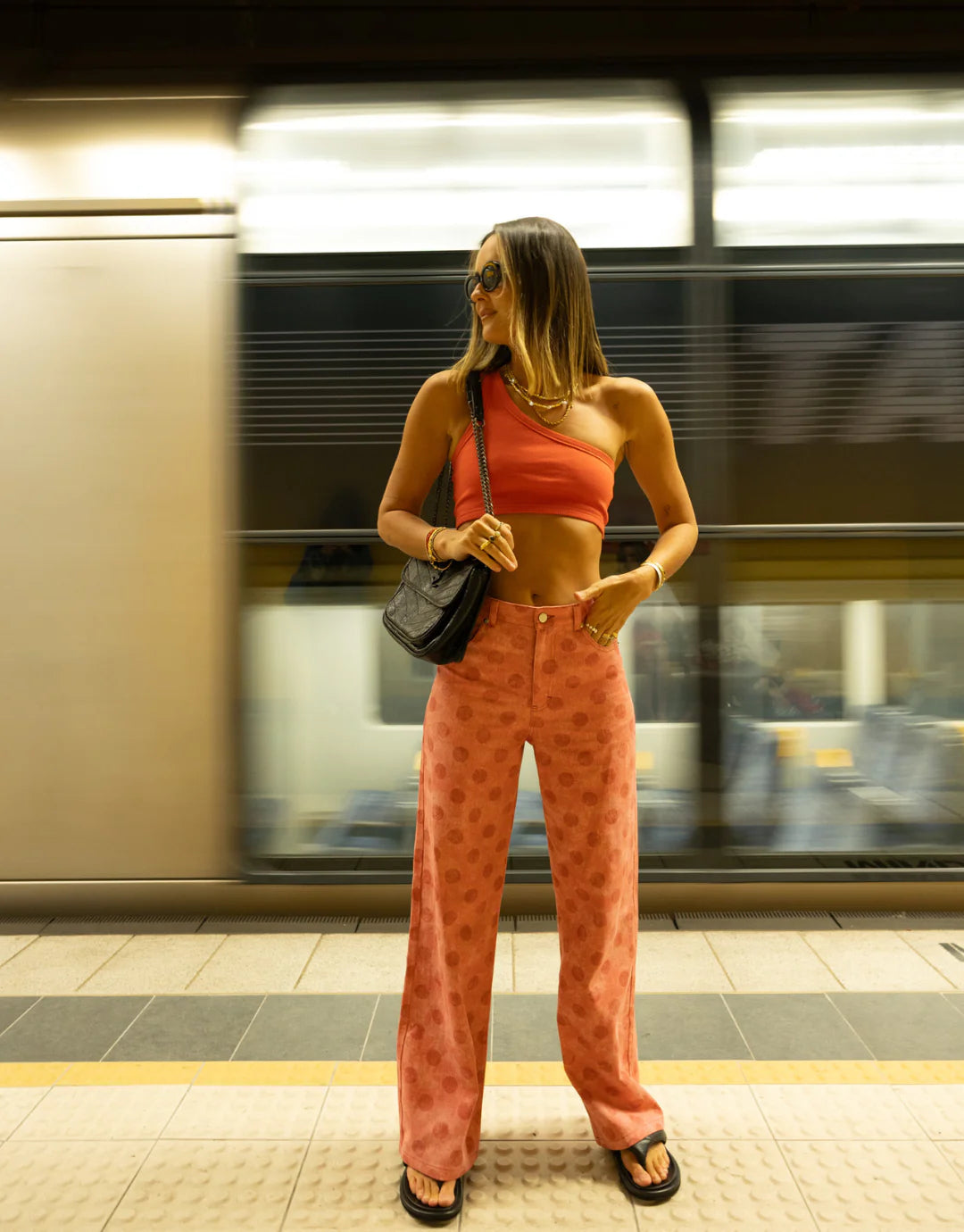 Crafted from premium cotton denim with a soft cream base, these jeans feature perfectly spaced chocolate brown dots for a modern twist on a classic print.