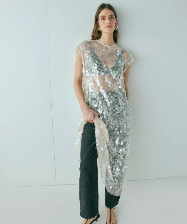 Make a statement in the Astrid Sequin Maxi Dress by VRG Girl, an ethereal showstopper designed to shimmer from day to night. Crafted with a sheer sequin fabrication and finished with a centre back shell button closure, this maxi dress brings elegance with an edge. It comes with a removable slip for versatile styling, while its oversized, relaxed fit makes it effortlessly chic.
